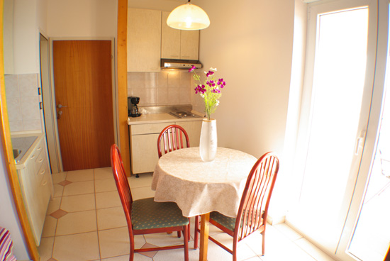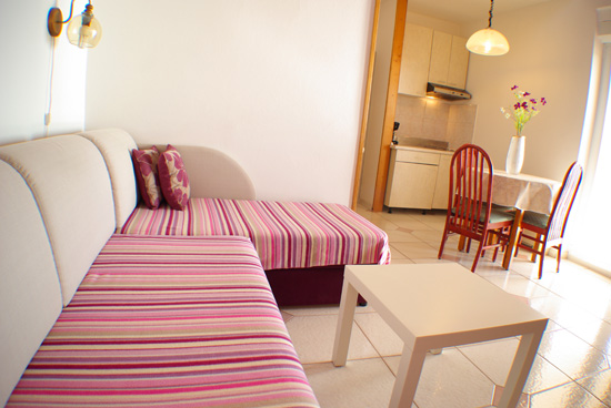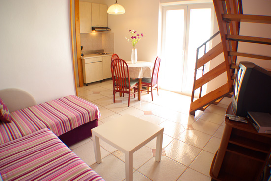 Apartment 2+1 it's an apartment with one bedrooms, kitchen with living room, bathroom and one terrace with a sea view. Bedrooom is located on the semi floor of the apartment. In the bedroom is a big double bed. In the kitchen You can find all the necessary for cook. You can also make a dinner on the terrace where is one table for 4 persons. The apartment is situated on the first floor of the house with the dimension of 40m2. It's ideal for one couple with child.